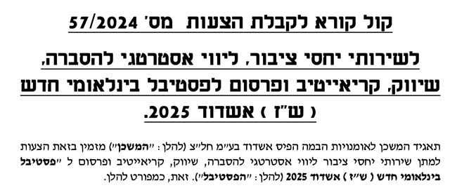 המשכן לאמנויות הבמה הוציא קול קורא לפרסום ויח״צ לפסטיבל בינלאומי לקולנוע. זהו פרסום ראשון לידיעה וככל הנראה אנחנו עוד נשמע לא מעט על המועד, הפרטים וסדר הגודל של הפסטיבל הבינלאומי לקולנוע.