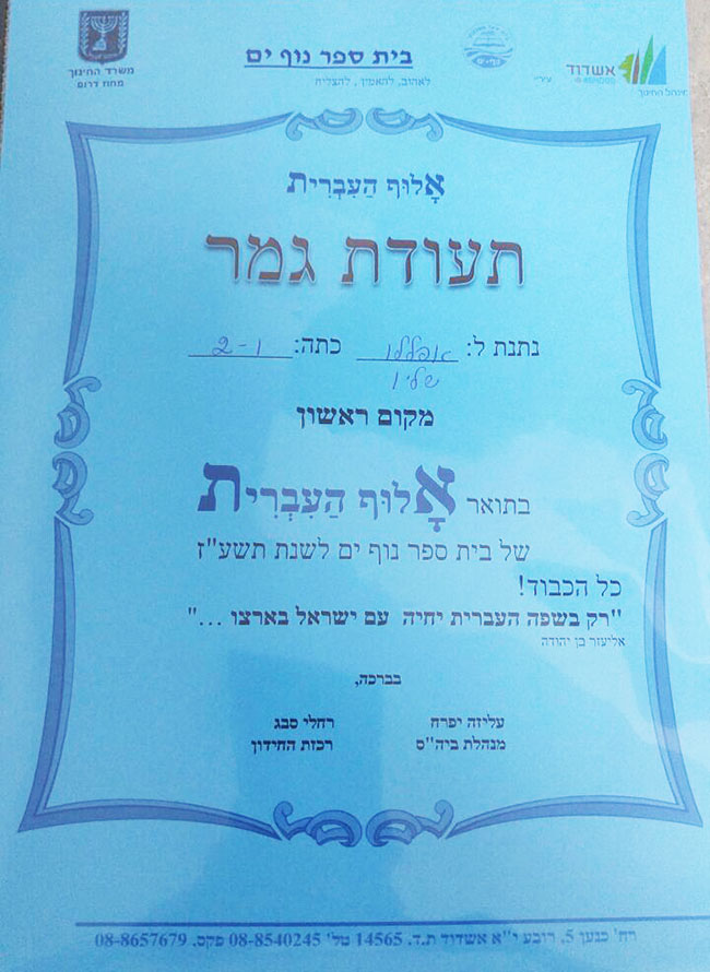 מנהלת בית הספר עליזה יפרח העניקה את התעודה לזוכה המאושר ובו הוענק לו התואר באופן רשמי.