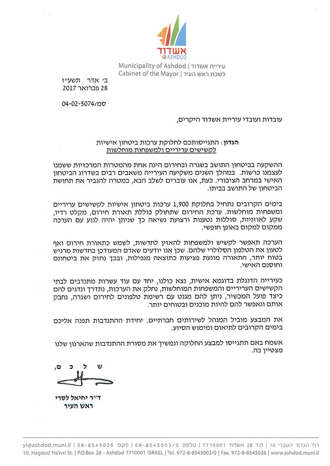 עיריית אשדוד, משקיעה משאבים רבים בתחושת הביטחון האישי של התושב ולאחרונה גם זכתה להיות מדורגת במקום השני בארץ ע"פ סקר הלמ"ס. ההשקעה בביטחון התושב בשגרה ובחירום הינן חשובה ביותר ולכן העירייה משקיעה משאבים רבים לאורך כל השנה בשדרוג הביטחון במרחב הציבורי. כעת, החלטנו להרחיב את תחום פעילותנו ולהיכנס גם למרחב האישי במטרה להגביר את תחושת הביטחון של התושב בתוך ביתו.