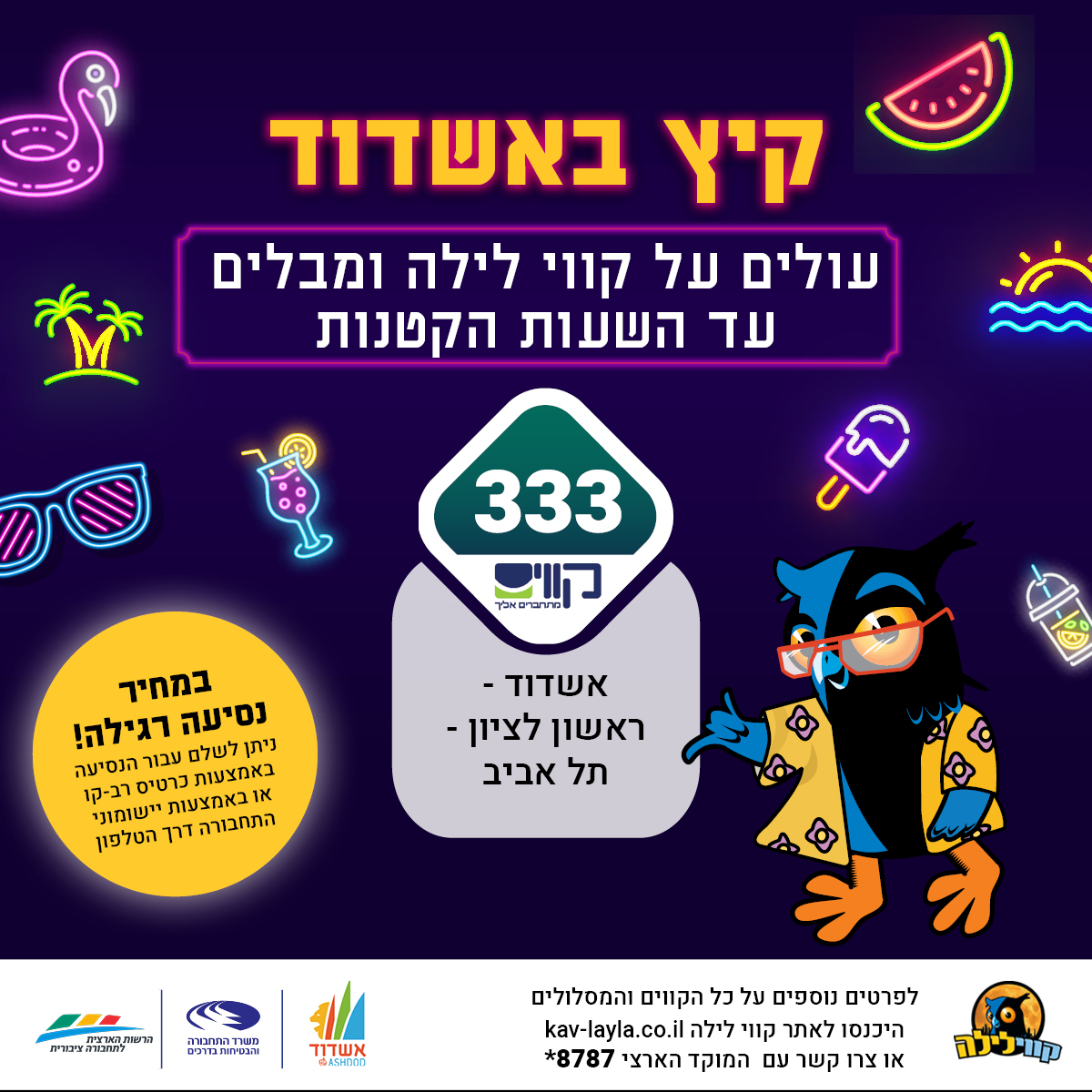 קו לילה אשדוד, קו 333, יפעל החל מיציאת מערכת החינוך לחופש, על ציר אשדוד – ראשון לציון – תל אביב, , והוא חלק מכ-100 קווי לילה שיפעלו במהלך הקיץ ביישובים רבים בארץ.