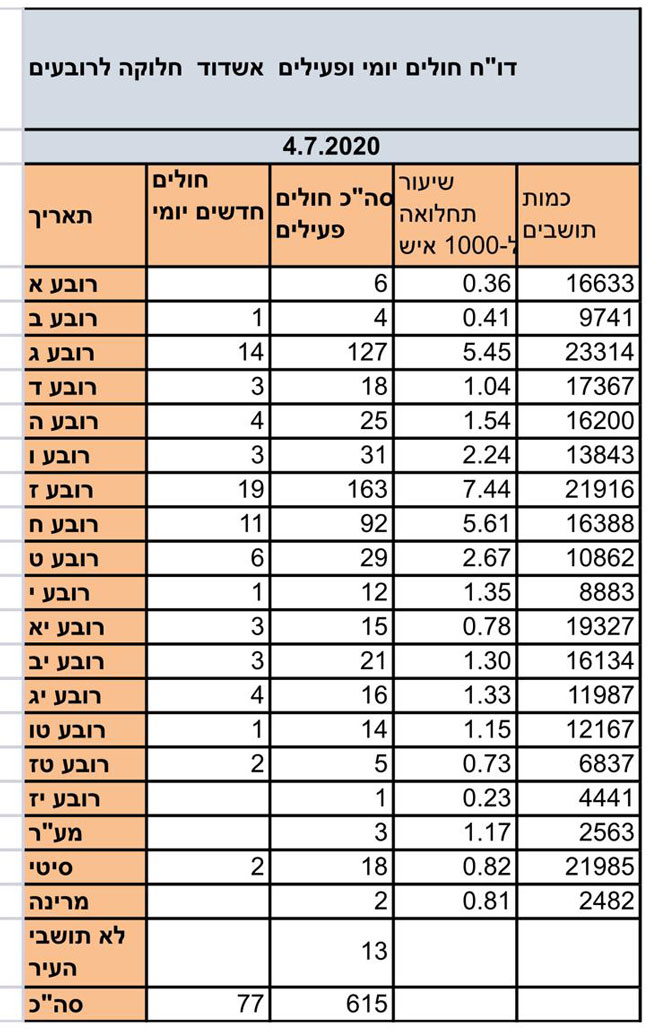 אשדוד לא מצליחה להתאושש מהגל השני גם בשבת האחרונה, עפ״י דו״ח שנמסר מעיריית אשדוד 77 חולים חדשים מה שמביא את מניין הנדבקים בעיר ל-692 נושאי נגיף פעילים. 44 מתוך ה-77 אותרו בשלושת הרובעים ג׳, ו׳ ו-ח׳ שנמצאים בסגר ועדיין מייצרים את כמות הנדבקים המשמעותית, כ-60% מכמות הנדבקים העירונית.